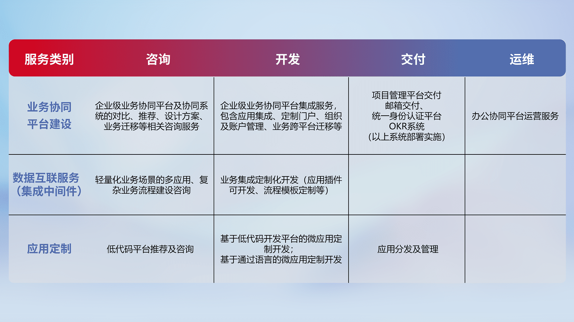 针对钉钉、、、、企微、、、、IDaas等平台级产品提供产品的规划、、、、方案、、交付、、、定制化开发等服务,,,实现如统一协同办公、、智能客户服务、、、混合会议管理、、智能数据查询、、等业务场景,,,,实现数字化转型。。。